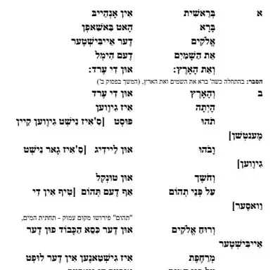בראשית – טייטש – ששת ימי המעשה – אידיש – עם שירים – והסבר