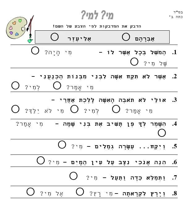 דף עבודה – הבנה – אברהם אליעזר רבקה – הדבק לפי הצבע