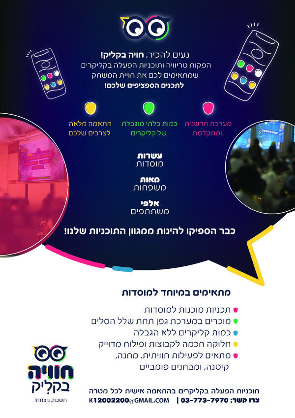 חברתינו מתמחה בהפקות טריוויה ותוכניות הפעלה בקליקרים ובטלפונים שמתאימים לכם את חויית המשחק לתכנים הספציפים שלכם!